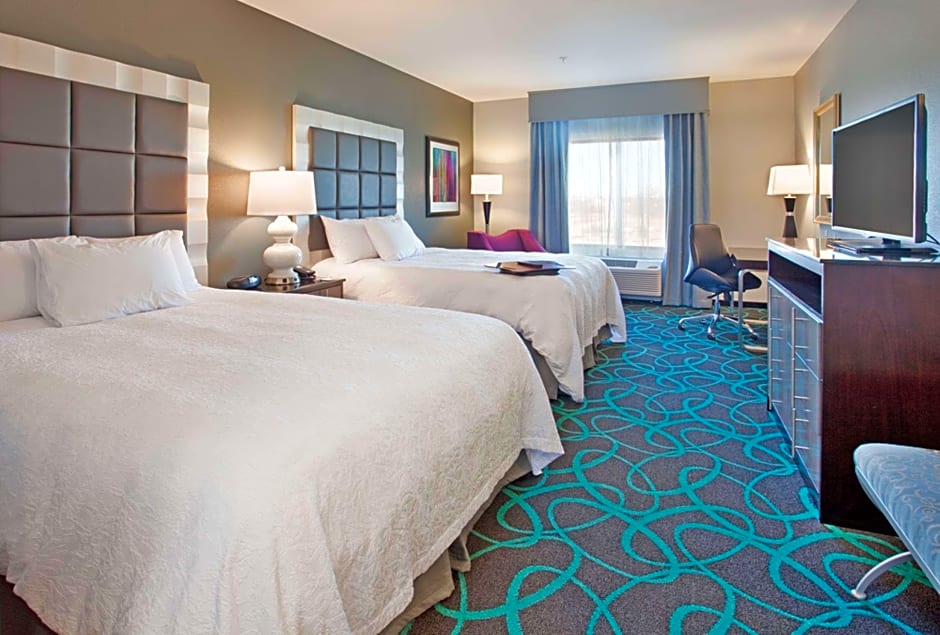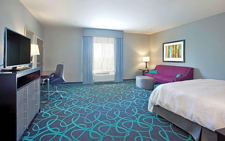 A 42-inch flat-screen cable TV and sofa bed are included in this hearing-accessible room, along with a microwave and fridge.
